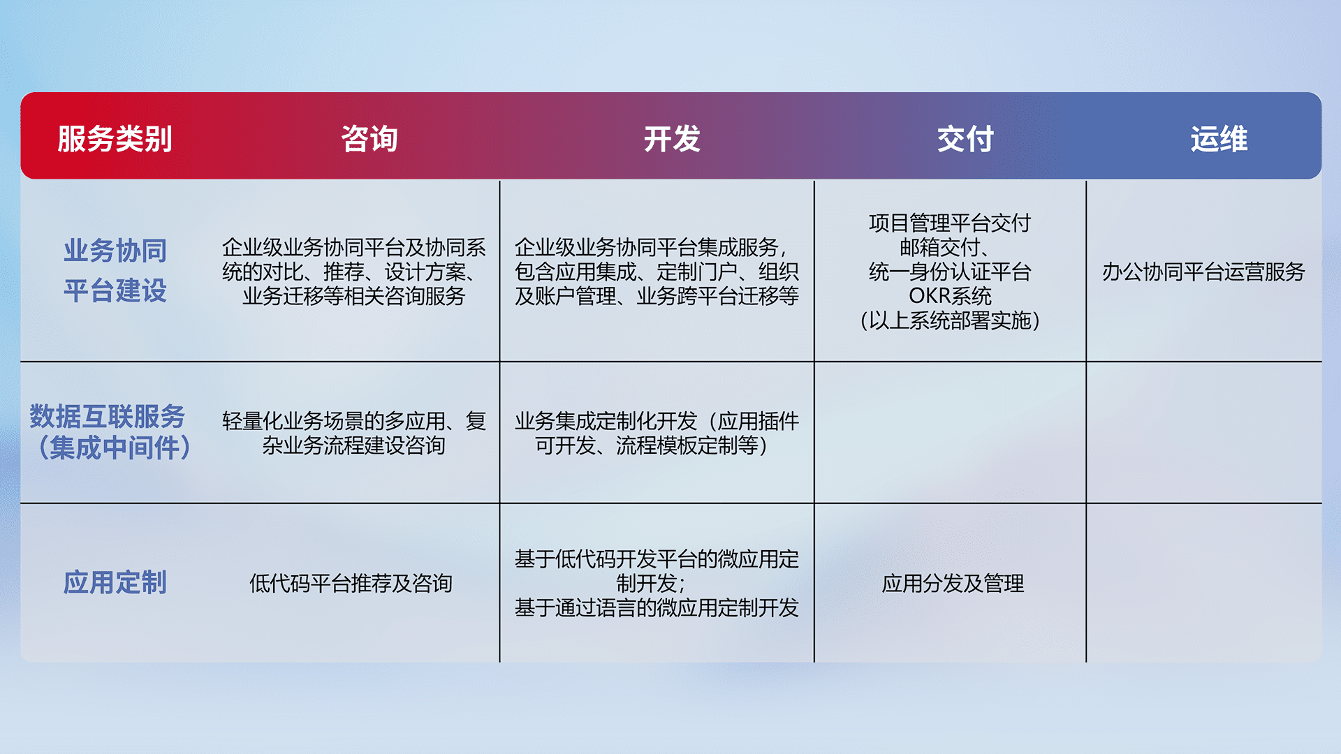 针对钉钉、、、、企微、、、IDaas等平台级产品提供产品的规划、、、方案、、、、交付、、定制化开发等服务,,,实现如统一协同办公、、智能客户服务、、混合会议管理、、、智能数据查询、、、、等业务场景,,,实现数字化转型。。。