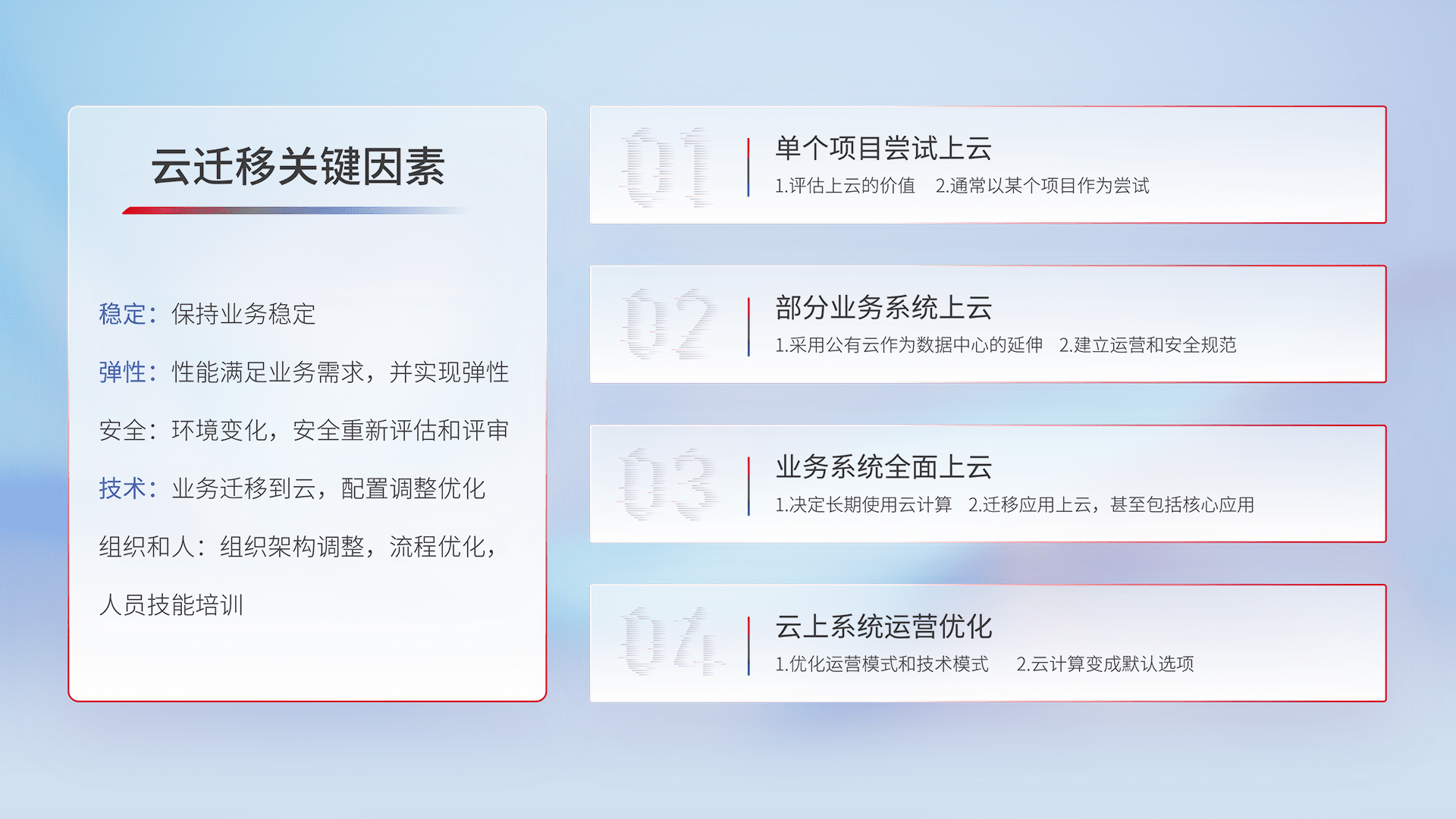 结合实际业务,,,,从规划设计、、云平台选型、、云原生改造、、、数据迁移、、、、集成交付,,迁移全过程为客户识别最佳上云路径,,做好风险识别管理,,,,设计网络架构、、、身份权限、、、安全审计合规、、操作审计、、、日志审计、、、监控告警策略、、、、多站点容灾设计等,,对云上基础设施进行整体规划,,,,提升IT治理水平,,以满足弹性、、、高可用、、、高性能的需求。。。