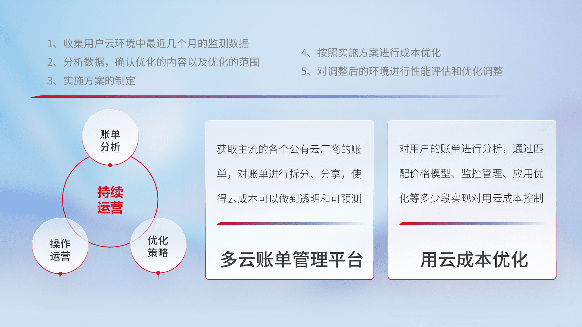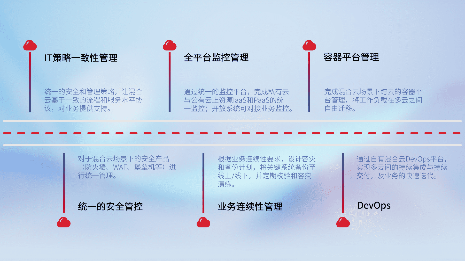 通过多云纳管,,以统一的资源数据模型把客户的云资源进行抽象和封装,,,,进而实现对多云资源的统一操作,,,,保障云资源管理的可靠性、、、稳定性与可用性。。。量身定制化运维内容,,,,配置、、、开发运维、、、、补丁管理、、、、备份、、、、监控、、、、认证和访问管理、、、、审计和日常巡检等,,,保障在用云过程中的可靠度,,,稳定度以及高可用率。。。。